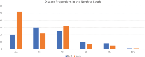 A higher proportion of ALL was diagnosed in the southern part of the country compared to the northern part (52/72; 72% versus 20/72; 28%,) while Burkitt lymphoma (10/17 (58.8% versus 7/17, 41.1%) and HL 8/13 (61.5^versus 5/13 (38.4%); were more common in the north than the south; χ2 14.804, p = 0.010, as shown in Figure 2.