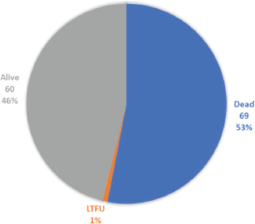 Out of 130 subjects, 53% died whilst 60 (46%) were still alive at the completion of the study, as shown in Figure 3. Early deaths within the first 3 months of diagnosis occurred in 25/69 (36%), and 44/66 (64%) deaths were recorded after the first 3 months of diagnosis.