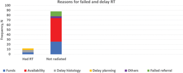 All centres have access to blood for transfusion. Four centres have equipment for pooled platelet and none for apheresis. Two centres have RT machines, while 1 has access to this service within the same city. All surgeons operate on patients; different treatment protocol exists in the study centres. A total of 109 patients had WT and RB; 95 of these required RT, i.e., WT (at least stage III) and RB (at least stage 1). Only 7 of these (7.4%) had the RT. None of the 5 patients with WT that had RT did so within 4 weeks post-surgery. No access to RT and delayed histology report were the commonest reasons for failure to irradiate when required and delayed irradiation, respectively, as shown in Figure 5.