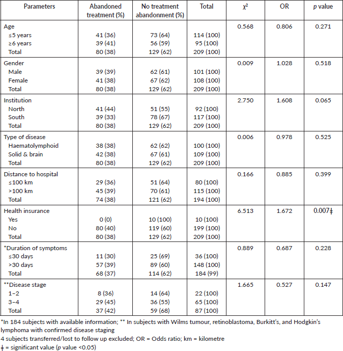 Treatment abandonment was more common in the north than the southern part of the country, 41/92 (45%) versus 39/117 (33%) respectively (p = 0.065). No subjects on health insurance abandoned treatment and treatment abandonment occurred solely in those with no health insurance (n = 10, χ2 = 0.012, p = 0.008). Age and gender were not risk factors for abandoning treatment (p = 0.271 and 0.518 respectively). There is a 1.6 odd of not abandoning treatment in subjects with health insurance, as shown in Table 3.