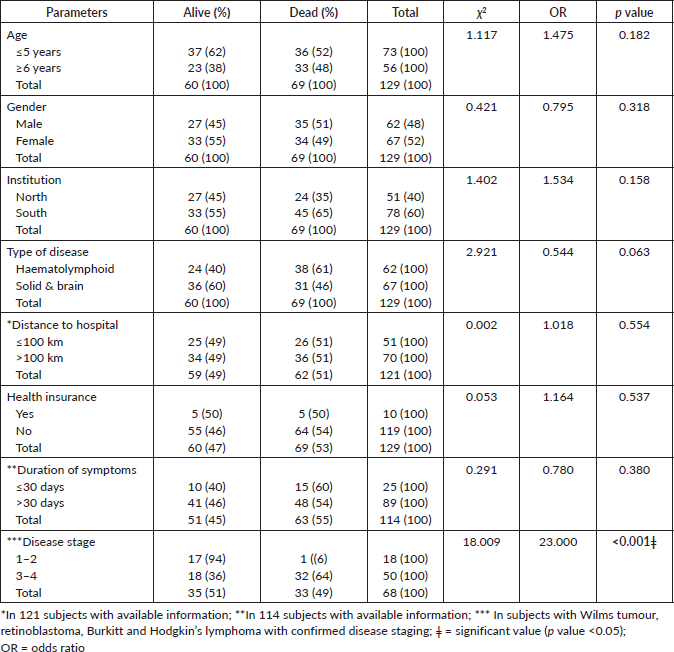 Results: A total number of 213 subjects were enrolled and ALL (n = 72;33.8%), WT (n = 57; 26.8%), RB (n = 52; 24.4%), BL (n = 17; 8.0%), HL (n = 13; 6.1%) and LGG (n = 2; 0.9%) accounted for the disease pattern. Median age at diagnosis was 5 years (51.6%). Mortality rate was 32.4% and treatment abandonment occurred in 37.6% of subjects. Treatment-related mortalities (TRMs) were 37.7% with infection and haemorrhage the commonest specific causes of TRM (36.1% and 42.5%). Only 7/95 (7%) of subjects with WT and RB stage III and IV benefited from RT. The most common reasons for non-RT were lack of funds (29%), lack of access to RT (54%) and lack of physicians’ referral (11%). Only 10 (4.3%) of subjects were enrolled in a health insurance scheme. Independent risk factor for mortality was advanced disease stage (p = <0.001). Amongst the mortalities, 36% died within the first 3 months of diagnosis.