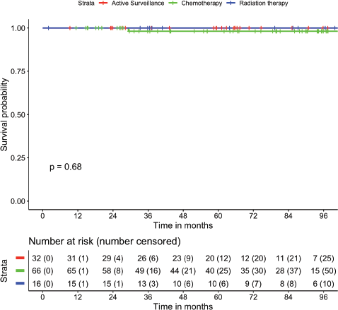 The primary end point of this study was to determine the RFS of patients with stage 1 seminoma on different modalities of treatment. Our secondary end point was to determine the overall survival (OS) of patients with stage 1 seminoma.