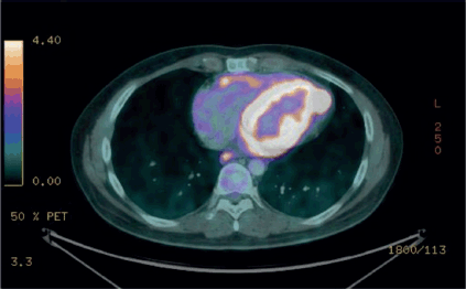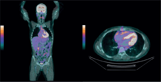 Figure 1. FDG PET positive for a solid lesion in the superior pericardial recess, extending to the myocardium (anterior wall of the left ventricle), as well as multiple solid nodules diffusely distributed in the pericardium and mediastinal lymph nodes with hypermetabolism.