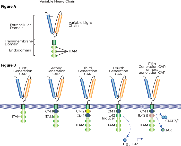 Figure 4 (A): General structure of a chimeric antigen receptor T-cell. (B): Generations of CAR-T cells.