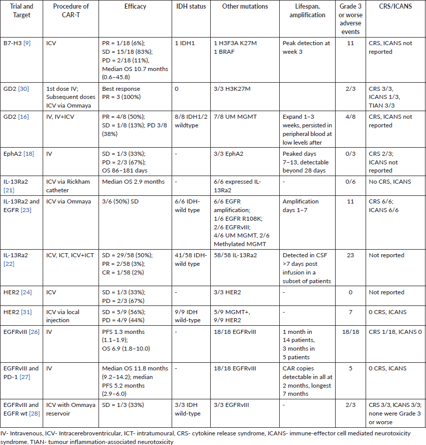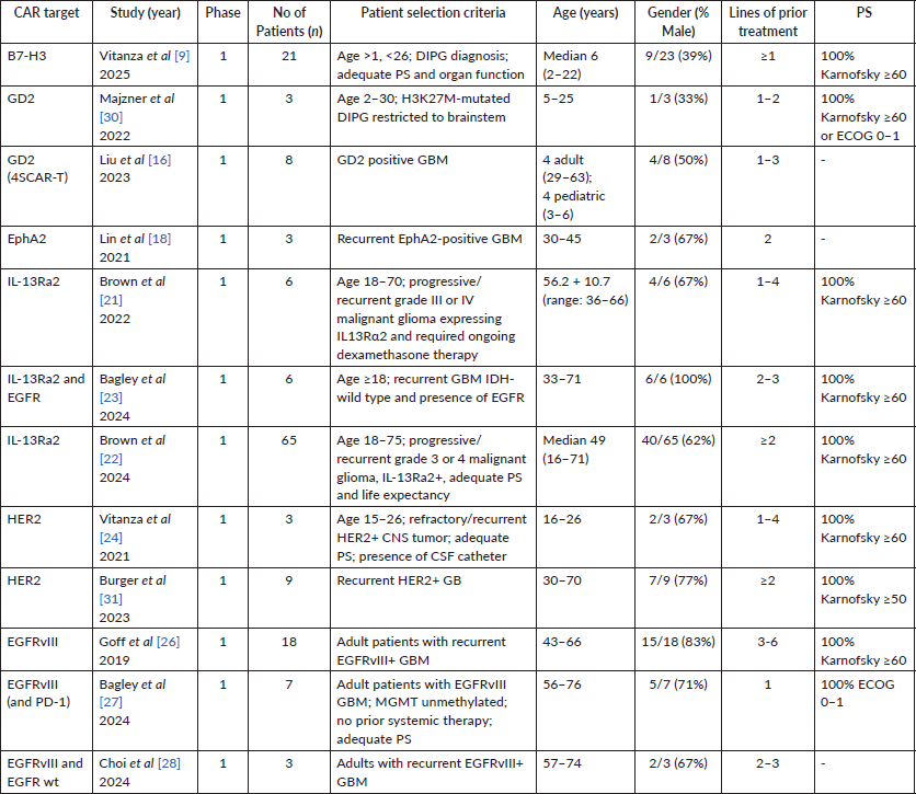 Key clinical trials for CAR-T in recurrent gliomas are described below. Target, patient demographics and performance status are described in Table 1. Outcome data, including OS and/or PFS, alongside adverse effect data, are included in Table 2.
