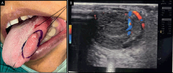 Figure 1. (a): Intraoral photograph showing swelling on the left lateral border of the tongue. (b): Ultrasonography of tongue showing mildly heterogenous lesion with smooth margins and vascularity.