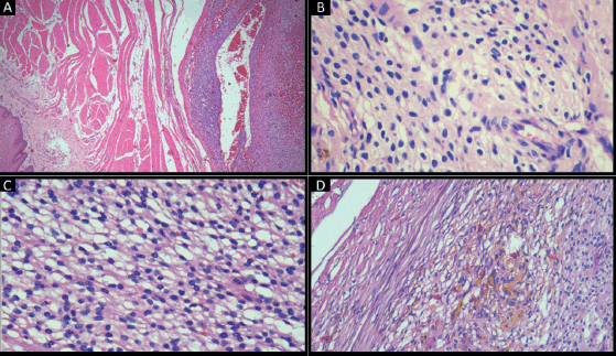Holding sutures were placed on the tip of the tongue and the postero-lateral aspect for ease of manipulation. Local anaesthesia (lignocaine 2% with 1:200000 adrenaline was injected and the swelling was excised. Bleeding was stopped with cauterisation and sutures were placed. The sample was sent for histopathological evaluation. Histopathology revealed stratified squamous parakeratinised epithelium overlying a fibro-cellular connective tissue stroma. The superficial stroma consisted of a well-circumscribed proliferation of predominantly round to ovoid cells in a perivascular arrangement that were surrounded by muscle fibres at the periphery. The cells had well-defined cell margins, clear to pale eosinophilic cytoplasm and vesicular nuclei. Focal areas showed spindle cells and ovoid cells with granular cytoplasm. Blood vessels of varying calibres and large areas of haemorrhage were present. This finding was consistent with the vascularity noted on the ultrasonogram and the isointense areas noted on the magnetic resonance imaging. Perivascular hyalinisation was noted, with some blood vessels showing a staghorn morphology. Patchy areas of hematoidin pigment were noted (Figure 2).