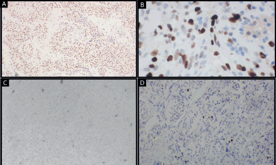 Figure 4. Tumour cells showing: (a): Diffuse positivity for alpha smooth muscle actin (original magnification ×4); (b): Diffuse positivity for TLE1 (original magnification ×40); (c): Focal positivity for CD34 (original magnification ×10); (d): Clusters of cells showing high proliferative activity (original magnification ×10). (Immunohistochemistry).