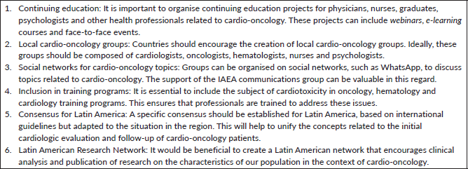 Cardio-oncology in LAC works in isolated groups and with diverse developments. We hope that, in the coming years, thanks to compliance with these recommendations and the support of organisations such as the IAEA, we will achieve uniform development throughout the region and the incorporation of the different cardio-oncology societies and working groups into international societies such as SIAC, iLACO and IC-OS, which will allow us to position ourselves in this increasingly important and necessary area, both in our countries and in the region, to promote the development of this new subspecialty.