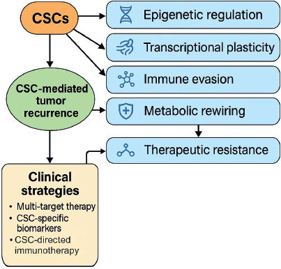 Figure 2. Conceptual diagram of CSC-mediated recurrence mechanisms and biological complexity. Conceptual representation of the major biological mechanisms contributing to CSC-mediated recurrence. The diagram illustrates how epigenetic regulation, transcriptional plasticity, immune evasion, metabolic rewiring and TME-driven reinforcement interact to sustain CSC persistence and therapeutic resistance. The diversity and interplay of these mechanisms underscore the intrinsic biological complexity of CSC-mediated relapse.