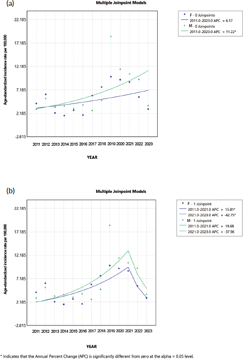 Figure 3. Joinpoint regression analysis of age-standardised CRC incidence rates per 100,000 population by sex in individuals aged 20 and older from 2011 to 2023 in Metepec, Mexico. Age-standardised CRC incidence rates per 100,000 population among females (blue color) and males (turquoise green) aged 20 to 80+ years from 2011 to 2023. (a): Zero-joinpoints model for both sexes. Males showed a significant increase in CRC incidence (APC = 11.22%, p = 0.02), while females showed a non-significant increase (APC = 6.57%, p = 0.17). (b): One-joinpoint model identifying two segments. Among males, a non-significant increase was observed from 2011 to 2021, followed by a non-significant decline from 2021 to 2023. Among females, the incidence increased significantly from 2011 to 2021 (APC = 15.81%, p < 0.01) and significantly decreased from 2021 to 2023 (APC = –42.75%, p = 0.05). APC: Annual Percent Change. F: Females. M: Males. Significance set at α = 0.05.