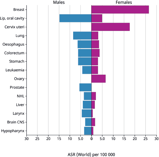 Figure 1. Age-standardised rate (world) per 100,000, incidence, males and females, in 2022 in India: GLOBOCAN [7].