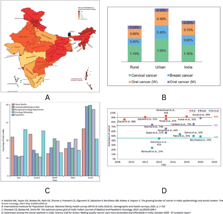 Figure 2. Cancer burden (A), screening uptake (B), oncology resources (C) and cancer awareness among patients (D) in India [41].
