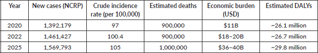 Table 1. Estimated cancer incidence, mortality and its economic impact in India, 2020–2025 [40].