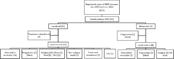 Limitations of this study include its retrospective nature and a small sample size, which preclude conclusive negation of the prognostic significance of the site of primary and other factors. Also, fusion status is not available for all and the sequelae of local therapy are not addressed in this analysis. Despite these shortcomings, this study provides a single-centre experience of GU-RMS, which is rare in childhood and can help plan future studies on a multi-centre platform in the country.
