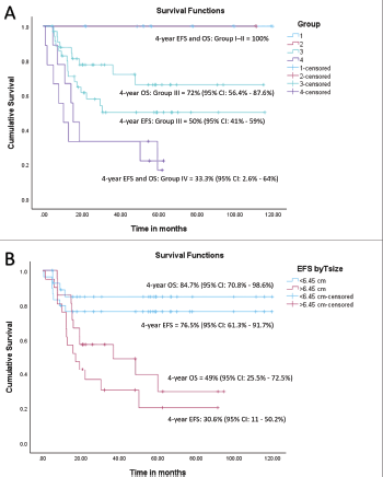 A tsize threshold of 6.45 cm emerged as a prognostic marker for outcomes, differing from the 5 cm threshold used in cooperative group studies [9]. For the entire cohort, the 4-year EFS rates were 76.5% (95% CI: 61.3%–91.7%) for tumours < 6.45 cm and 30.6% (95% CI: 11–50.2%) for tumours > 6.45 cm (HR = 3.6, 95% CI: 1.45–8.98, p = 0.006). Among patients with localised disease, the corresponding 4-year EFS rates were 81.3% (95% CI: 67.6%–95%) and 28% (95% CI: 4.5%–51.5%) (HR = 4.1, 95% CI: 1.38–12.1, p = 0.01). Similarly, the 4-year OS rates for the entire cohort were 84.7% (95% CI: 70.8%–98.6%) for tumours < 6.45 cm and 49% (95% CI: 25.5%–72.5%) for tumours > 6.45 cm (HR = 4.38, 95% CI:1.4–13.7, p = 0.01). For the localised cohort, the corresponding 4-year OS rates were 91.5% (95% CI: 80.1%–100%) and 53.3% (95% CI: 23.9%–82.7%), (HR = 6.93, 95% CI: 1.4–34.1, p = 0.017), respectively. Details are tabulated in Table 2. Survival curves are presented in Figures 3a,b and 4a,b.