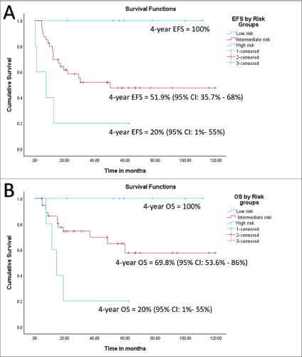 Figure 4. (a) EFS of whole cohort by risk group and (b) OS of whole cohort by risk group.