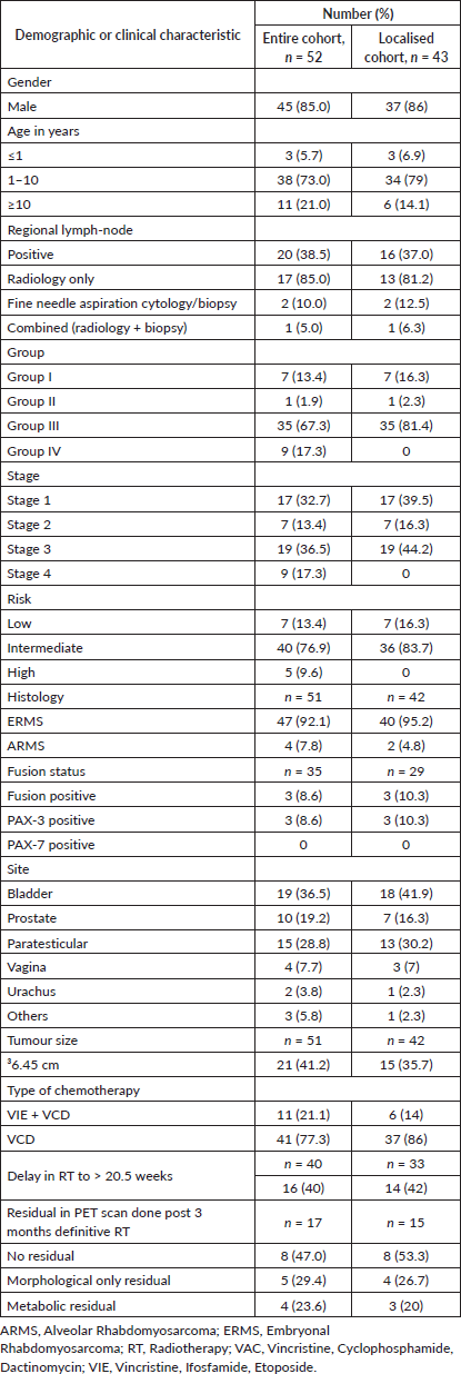 Two patients had events before local control (abandoned treatment-1, progression-1). For the remaining 50 patients, local treatment was definitive radiotherapy in 25 (49%), only surgery in 11 (21.5%-paratesticular (High inguinal orchiectomy) = 8, prostate (pelvic mass excision) = 1, bladder (radical cystectomy) = 1, urachus (excision) = 1) and combined (surgery + RT) in 14 (26.9%- Paratesticular (High Inguinal orchiectomy) = 6, Bladder dome (partial cystectomy, radical cystectomy with ileal conduit) = 2, Bladder neck (radical cystectomy with ileal conduit) = 2, Vagina (mass excision) = 2, Labia (wide excision) = 1 and Urachus (excision) = 1) patients. Surgical resection was R0 (n = 16), R1 (n = 1) or R2 (n = 4). Surgical details were not available in four patients who were operated upfront outside the institution (None received RT; two had metastatic disease and progressed while on chemotherapy, one had Group I disease and the fourth died due to sepsis). Median time to any local therapy for the primary was 14.5 weeks (range, 0–19.9 weeks). Twenty children received local therapy before 10–12 weeks (Para testicular = 13, Bladder =5, Prostate =1, Vagina = 1), reasons being: Prostate-operated upfront outside and presented to us with metastatic disease and progressed on chemotherapy; Vagina-Surgery (R0) at 12 weeks, followed by adjuvant radiotherapy; Bladder 1-definitive RT at 10 weeks; Bladder 2-definitive RT at 10.8 weeks; Bladder 3-upfront outside operated, died of urosepsis while on chemotherapy at our centre; Bladder 4 and 5-early surgery at 6 and 7 weeks, respectively (followed by adjuvant RT), as both had presented with bladder outlet obstructions (one with suprapubic cystostomy, the other with bilateral pervutaneous nephrostomies), complicated by recurrent urinary tract infections compromising delivery of chemotherapy. Median time to RT was 20.2 weeks (range, 17.4–24.1 weeks). Brachytherapy was used in two patients (bladder dome RMS = 1 and labial RMS = 1).