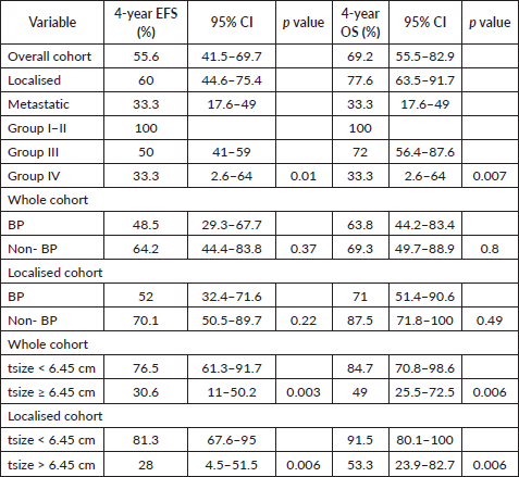 The outcomes for metastatic disease in our cohort were poor, with both 4-year EFS and OS at 33.3%, aligning with global data [2, 4]. This underscores the necessity of managing such high-risk groups within the context of clinical trials to explore innovative therapeutic strategies and improve survival outcomes.