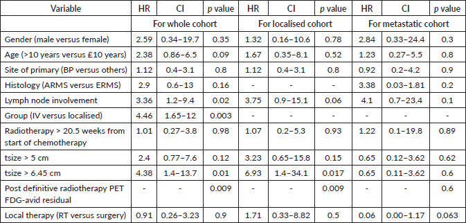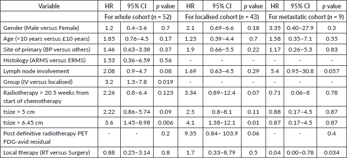 For the entire cohort, univariate analysis identified metastatic disease (HR = 3.2, 95% CI: 1.3–7.8, p = 0.019), time to the first modality of local therapy (HR = 1.05, 95% CI: 1.00–1.10, p = 0.037) and tumour size > 6.45 cm (HR = 3.6, 95% CI: 1.45–8.98, p = 0.006) as prognostic for EFS. However, on multivariate analysis, only tumour size > 6.45 cm remained significant (HR = 3.99, 95% CI: 1.35–11.8, p = 0.012). For OS, univariate analysis revealed metastases (HR = 4.46, 95% CI: 1.65–12, p = 0.003), tumour size > 6.45 cm (HR = 4.38, 95% CI: 1.4–13.7, p = 0.01) and post-RT PET FDG-avid residual disease (p = 0.009) as significant prognostic factors. On multivariate analysis, only tumour size > 6.45 cm remained significant (HR = 3.8, 95% CI: 1.1–12.7, p = 0.031). Details are provided in Tables 35.