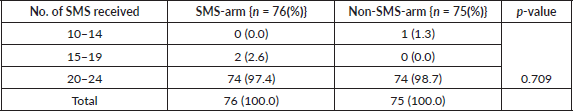 There was no significant difference between the profile of participants in the control and in the intervention arms with almost half (49.3%) reporting to have never heard about HPV and majority (60.9%) having never heard about the HPV vaccine (Table 1). The majority of the respondents 97.4% in the SMS-arm and 98.7% in the non-SMS arm received between 20 and 24 SMS (Table 2).