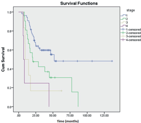 Figure 4. Kaplan Meier curve showing the effect of stage of the tumour on recurrence.