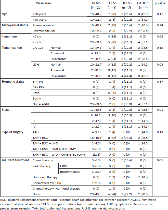 Pathological characteristics are described in Table 2. The majority of cases were predominantly diagnosed in stage I (ULMS = 37.6%, LGESS = 16.5%, HGESS = 4.7%; OTHERS = 4.7%) followed by stage II (ULMS = 10.6%, LGESS = 9.4%, HGESS = 3.5%; OTHERS = 1.2%). Stage III presentation was seen in two (2.4%) cases each of ULMS and LGESS and one (1.2%) case each of HGESS and OTHERS category. There was one (1.2%) case each of stage IV in all the categories.