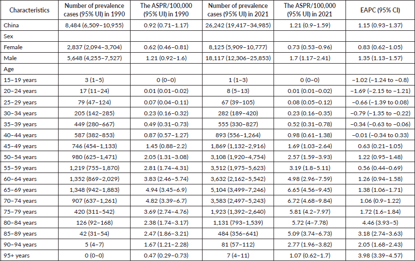 Table 2. The number of prevalence cases and the ASPR attributable to A-LC in 1990 and 2021, and its trends from 1990 to 2021 in China.