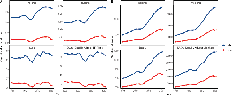 Figure 4. Depicts the trends of ASRs and corresponding number of cases associated with incidence, prevalence, death and disease-disability-adjusted life expectancy of A-LC patients of different genders in China from 1990 to 2021.