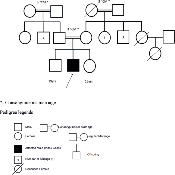 He was born at term to third-degree consanguineous parents with a normal birth weight. The antenatal and postnatal periods were uneventful. There was history of delayed attainment of developmental milestones and epilepsy for which he was on antiseizure medications . He was completely immunised, and his scholastic performance was average, with poor social and communication skills.