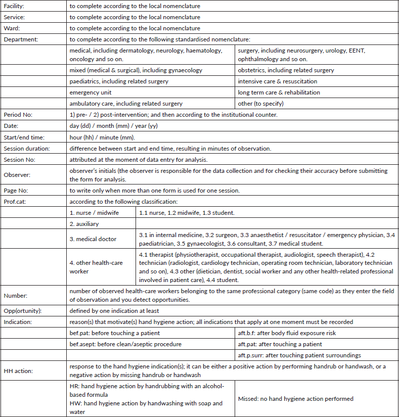 Each column of the grid to record hand hygiene practices is intended to be dedicated to a specific professional category. Therefore numerous health-care workers may be sequentially included during one session in the column dedicated to their category. Alternatively each column may be dedicated to a single health-care worker only of whom the professional category should be indicated.
