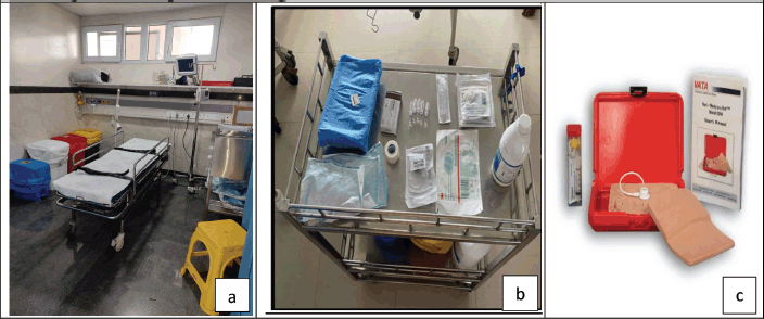 These training sessions were conducted by the QI team for all the nurses and doctors working in PER. Reading material on infection control, HH, CCP flowchart and FN management guidelines developed by the Indian Academy of Paediatrics was provided 1 week before the training session [14]. Four training sessions were conducted (two in each PDSA cycle). A pre-test was held before each session. These sessions lasted 3 hours each and included lectures on the aspects mentioned above, with interactive participation and demonstration of chemoport needle insertion and maintenance using a mannequin. The mannequin used was VATA Inc.’s ‘Body in a box’ 5,010 model (Figure 2c), which is a simulation mannequin of the paediatric chest with a chemoport in situ, allowing for needle insertion, aspiration of blood-coloured dye, flushing and clamping. The bundle checklist for chemoport insertion and maintenance was also discussed (Annexure 2). This checklist was displayed in the isolation cubicle for guidance during central line (CL) handling. A post-test was provided after the session to evaluate the impact of the training session (Annexure 3).
