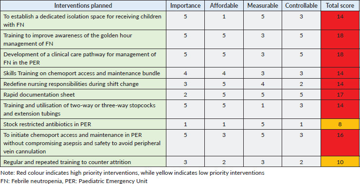 A process flowchart, as described in Figure 1a, was developed. All healthcare providers (HCPs), i.e., nurses, paediatric residents and faculty involved in treating children with FN in the PER were requested to identify steps in the flowchart contributing to delays in antibiotic administration as well as factors contributing to such delays. These data were procured by conducting interviews, small group discussions and online surveys. The data were consolidated using a fishbone diagram (Figure 1b), and interventions planned (Table 1) were prioritised using the prioritisation matrix (Table 2). All the causes of delayed DTNT were listed. Each of these was scored on a scale of five concerning four parameters – importance, affordability, measurability and modifiability. Scoring was done based on the relative value of one process/outcome over the other. A cut-off score ≥ 12 was given maximum priority based on which interventions were planned and implemented during PDSA 1, as indicated by the red boxes in Table 2.