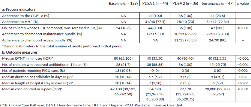 Methods: Baseline data of children less than 18 years of age on cancer chemotherapy presenting with neutropenic fever between January 2022 and June 2023 were collected ambispectively. A fishbone root cause analysis was performed. Interventions were planned and prioritised using a prioritisation matrix. QI measures were initiated subsequently in the form of the development and implementation of a validated clinical care pathway that described the triaging, clinical assessment, laboratory investigations, antibiotic dosing and patient disposition. Additionally, mannequin-assisted, followed by bedside training on chemoport handling, was performed. Post-intervention data, including the 6-months sustenance phase, were collected, and outcomes were analysed.