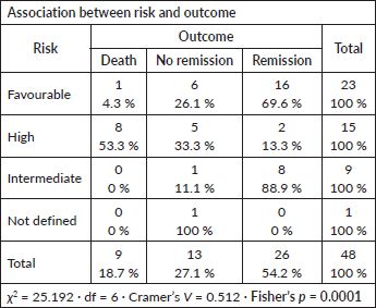 Induction outcomes comprised complete remission in 47%, no remission in 23%, induction death in 16% and treatment abandonment in 14%. Literature from both developed and developing countries shows remission rates of 56%–83% and induction mortality between 3% and 25% [16, 17, 29–42]. When patients who abandoned therapy were excluded, only ELN risk category retained a statistically significant association with outcome: high-risk patients were more likely to fail induction or die, while favourable-risk patients achieved higher remission rates. This association has been consistently reported in prior studies [30–33].