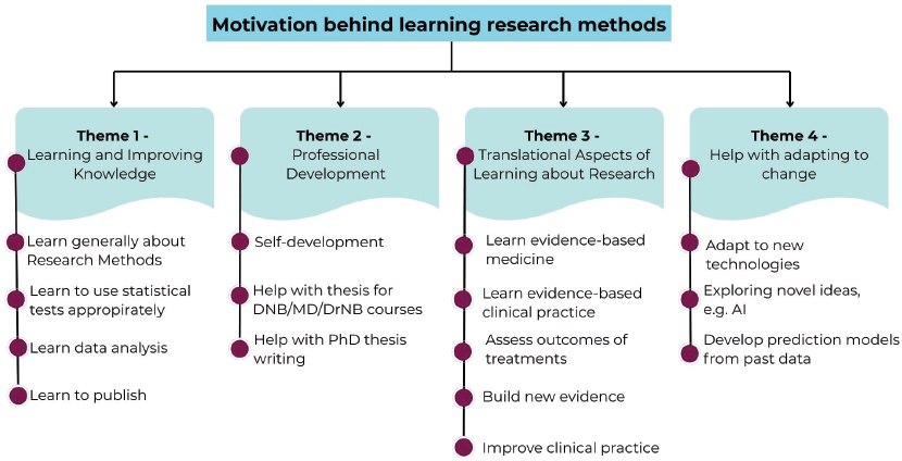 From Figure 1, it is evident that the participants were motivated to learn about research methods to achieve their goals of gaining knowledge about research methodology and statistical analysis, developing their professional skills, improving clinical outcomes and making an impact on their own work in their respective roles.