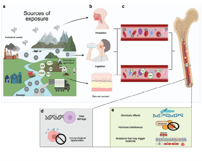Figure 3. Main contact pathways of contaminated water by TM and pesticides related with CL development. (a) WP with TM and pesticides by sewage, industrial waste and pesticide use in agriculture. (b) The contaminants may enter into the human body through different ways: inhalation, ingestion and/or dermal contact. (c) Circulation of the toxic agent in the vascular system up to the bone marrow and their absorption. (d) Cellular impact of TM in hematopoietic cells potentially involved to the development of CL. (e) Described possible effects of pesticides exposure in the hematopoietic cells related to the development of CL [50, 51].