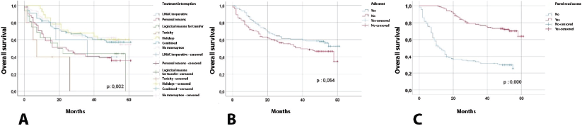 Table 4 and Figure 1 present the comparison of progression-free survival, finding that the following variables were statistically significant: No interruption (39.69 months) versus interruption (19.43 months), no adherence (26.58 months) versus adherence (37.16 months) and no paved road access (19.19 months) versus paved road access (43.04 months). With regard to overall survival, the following variables were statistically significant: no interruption (43.12 months) versus interruption (32.22 months), no road access ( ) versus paved road access (50.76 months) (Figure 2).