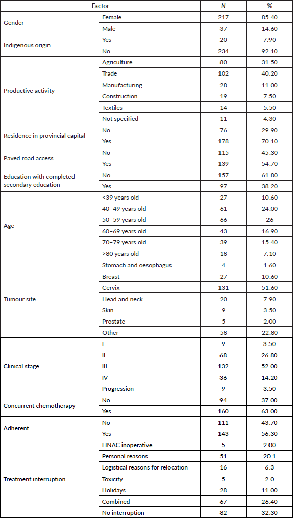 The sample of cases that met the evaluation criteria was 254. The general characteristics are shown in Table 1. Of note are the indigenous origin of 7.9%, residence in the provincial capital of 70.1%, access to paved roads of 54.7%, completion of secondary education of 61.8% and adherence of 56.3%.