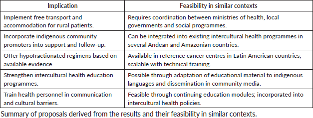 Policy implications should be aimed at reinforcing the idea that structural and sociocultural factors have a greater impact than individual clinical characteristics in vulnerable contexts, underscoring the need for specific and sustainable institutional interventions. The implementation of hypofractionated regimens can reduce treatment duration and facilitate compliance. Likewise, free transport and accommodation programmes, staff training in intercultural communication and the participation of indigenous community promoters are feasible strategies with high potential for impact. These proposals, summarised in Table 5, respond to the need to address health inequalities from a comprehensive perspective.