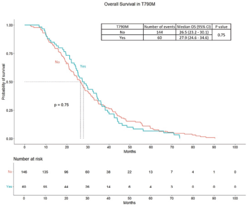 without T790M mutations (p = 0.95). Overall survival was 27.9 months (95% CI: 24.6–34.6 months) in the T790M group compared to 26.5 months (95% CI: 23.2–30.1 months) in the non-T790M group (p = 0.75).