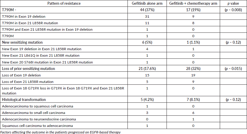 Materials and methods: This post hoc analysis of a Phase III trial conducted at Tata Memorial Centre (TMC) in Mumbai, India, included 350 patients with advanced EGFR-mutant NSCLC. Patients were randomised to receive either gefitinib alone (n = 176) or gefitinib with chemotherapy (pemetrexed and carboplatin, n = 174). The primary objective was to identify resistance mechanisms following progression. Secondary objectives included comparing resistance patterns between the two arms and assessing progression rates and outcomes. At progression, histological and molecular evaluation was done with reverse transcription polymerase chain reaction (RT-PCR), anaplastic lymphoma kinase – immunohistochemistry (ALK IHC) and/or next generation sequencing (NGS) at physician discretion.