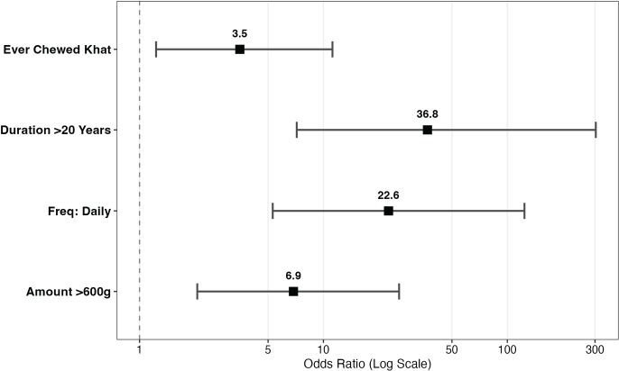 Chewing khat for more than 20 years was strongly associated with UDT cancer risk (aOR 36.8, 95% CI 7.16–303; p < 0.001). Daily chewing carried an aOR of 22.6 (95% CI 5.30–124; p < 0.001), while consuming more than 600 g per session was associated with an aOR of 6.87 (95% CI 2.06–25.8; p = 0.002) (Table 1, Figure 1).