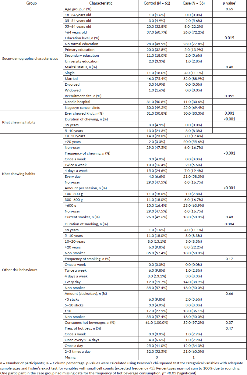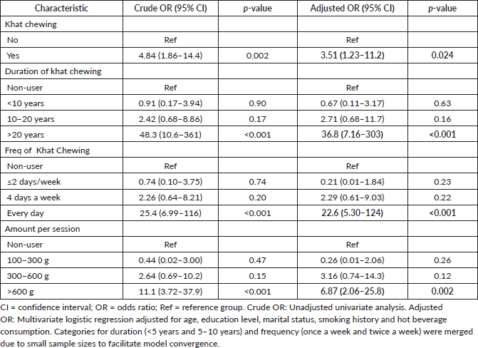 The majority of participants were aged over 64 years, had no formal education and were married (Table 2). Cases had significantly lower education levels (p = 0.015) compared to controls. A significantly higher proportion of cases reported ever chewing khat (83.3% versus 50.8%; p = 0.001), chewing for >20 years (55.6% versus 3.3%; p < 0.001), daily chewing (58.3% versus 6.6%; p < 0.001) and consuming >600 g per session (63.9% versus 16.4%; p < 0.001). No significant differences were observed in smoking status, smoking duration, frequency or amount, nor in hot beverage consumption.