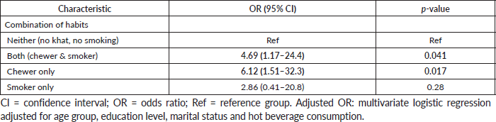 An additional model examining the combined effect of khat chewing and smoking showed that individuals who only chewed khat had the highest risk (aOR 6.12, 95% CI 1.51–32.3; p = 0.017), followed by those who both chewed khat and smoked (aOR 4.69, 95% CI 1.17–24.4; p = 0.041). Smoking alone was not significantly associated with increased risk (aOR 2.86, 95% CI 0.41–20.8; p = 0.28) (Table 3).