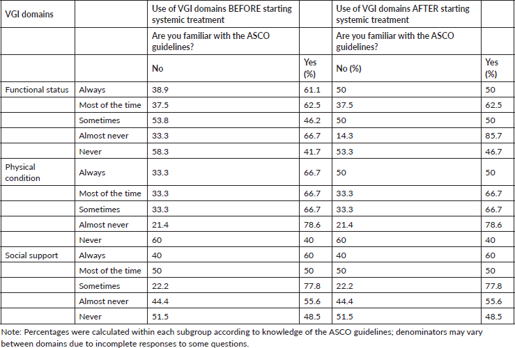 Regarding the use of formal tools, our results show that those who are familiar with the ASCO guidelines not only report evaluating older adults more frequently in a differentiated manner, but also use validated instruments more frequently before and after initiating systemic treatment.