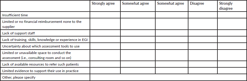 0. Indicate your level of agreement regarding BARRIERS to performing a geriatric assessment for your patients aged 65 and over: