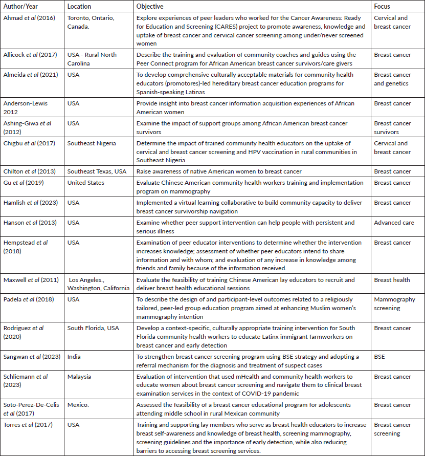 The review considered peer education programs aimed at increasing awareness, improving knowledge and enhancing uptake of breast cancer prevention and screening services. Interventions included home visits, group workshops, culturally tailored community education, storytelling, faith-based activities, health fairs and mobile health tools.