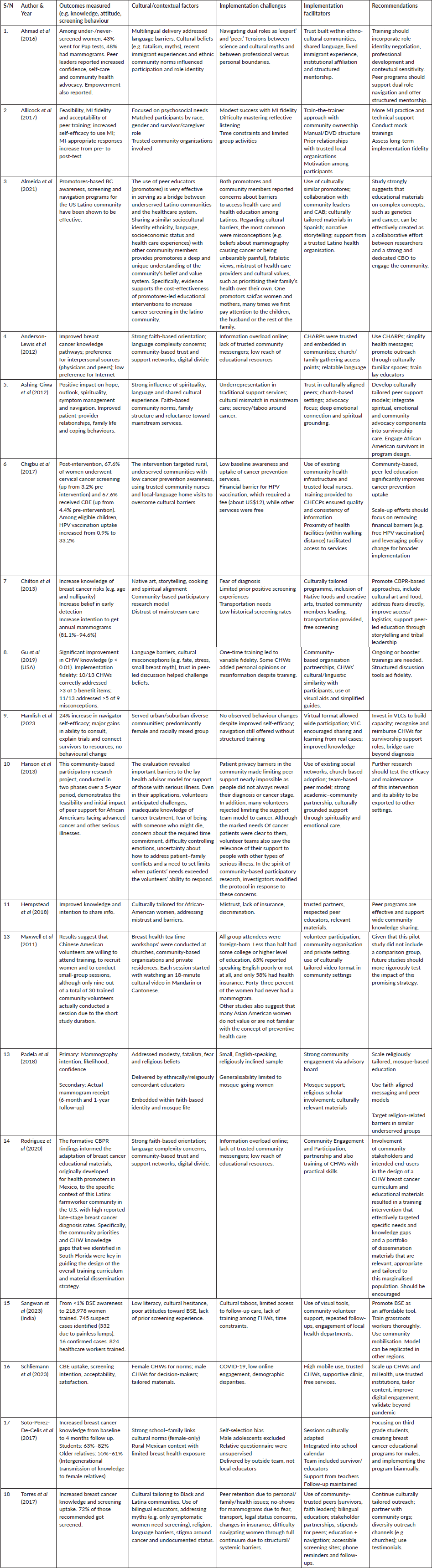 Despite promising outcomes, several challenges were identified across the studies. Rodriguez et al [25] reported tensions among peer educators as they struggled to balance their roles as both experts and community members. Baethge et al [13] found that although participants gained confidence in motivational interviewing (MI), mastering reflective listening and managing time constraints remained difficult. Barriers such as mistrust, lack of insurance and limited reach of educational resources were highlighted by [20, 24]. In rural India, [26] identified cultural taboos, low literacy levels and limited access to trained healthcare providers as significant obstacles. Similarly, [23] noted challenges in peer retention, transportation and screening attendance in the U.S., often linked to fear, undocumented status and systemic barriers.