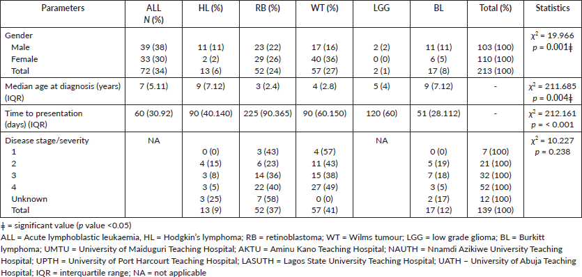 A total of 213 patients were recruited with a slightly higher female proportion (0.9:1.0) in all the diseases. The median age at time of diagnosis is 5 years (IQR 11 months, 17 years). Adolescents aged 18 and 19 years were not seen in in the paediatric section of any institution. Patients with ALL, WT, RB and LGG presented at a significantly earlier years compared to those with BL and HL (χ2 211.685; p = 0.020). The most are ALL (n = 72; 34%), WT (n = 57; 27%) and RB (n = 52; 24%). There was no case of bilateral Wilms tumour (stage V).